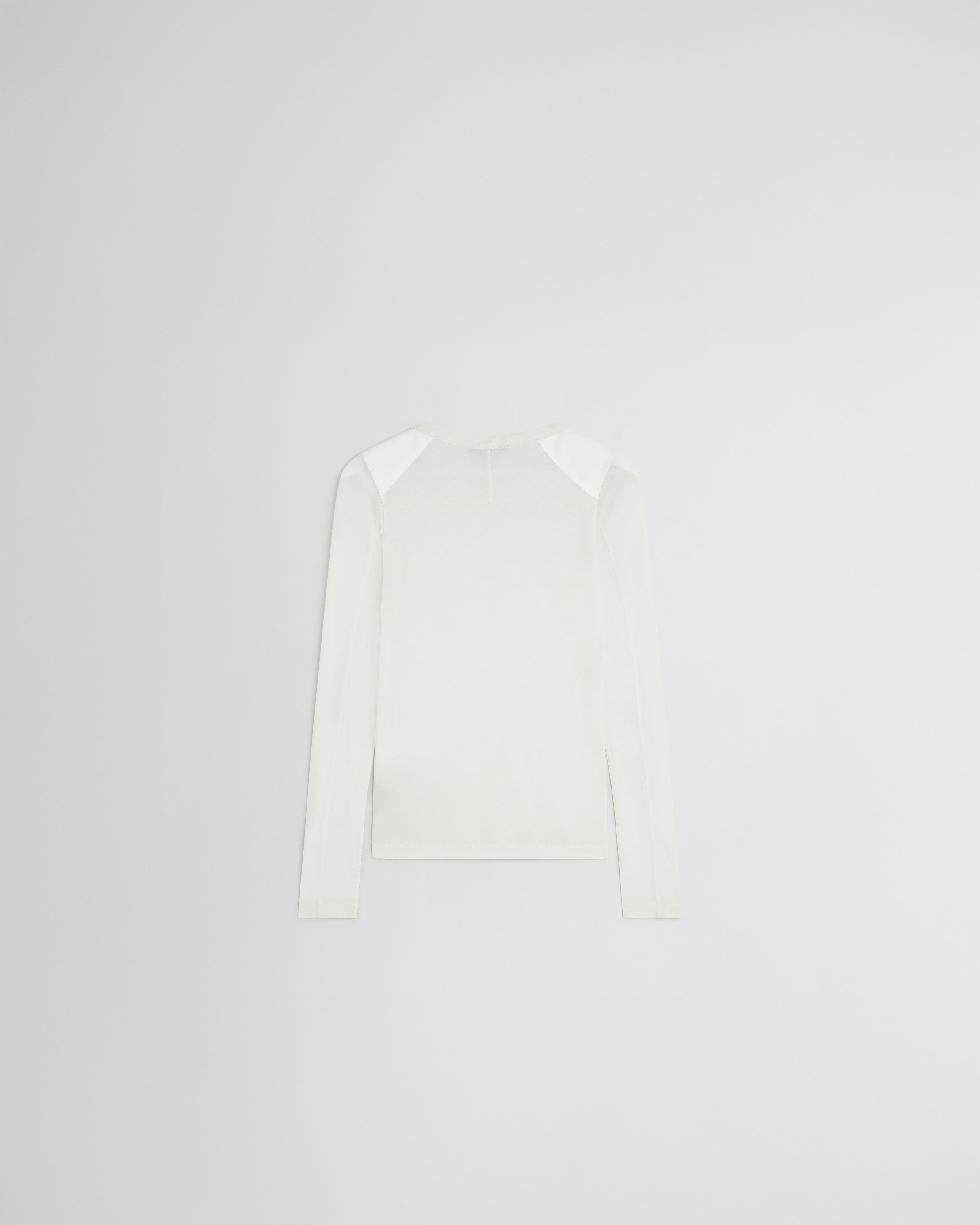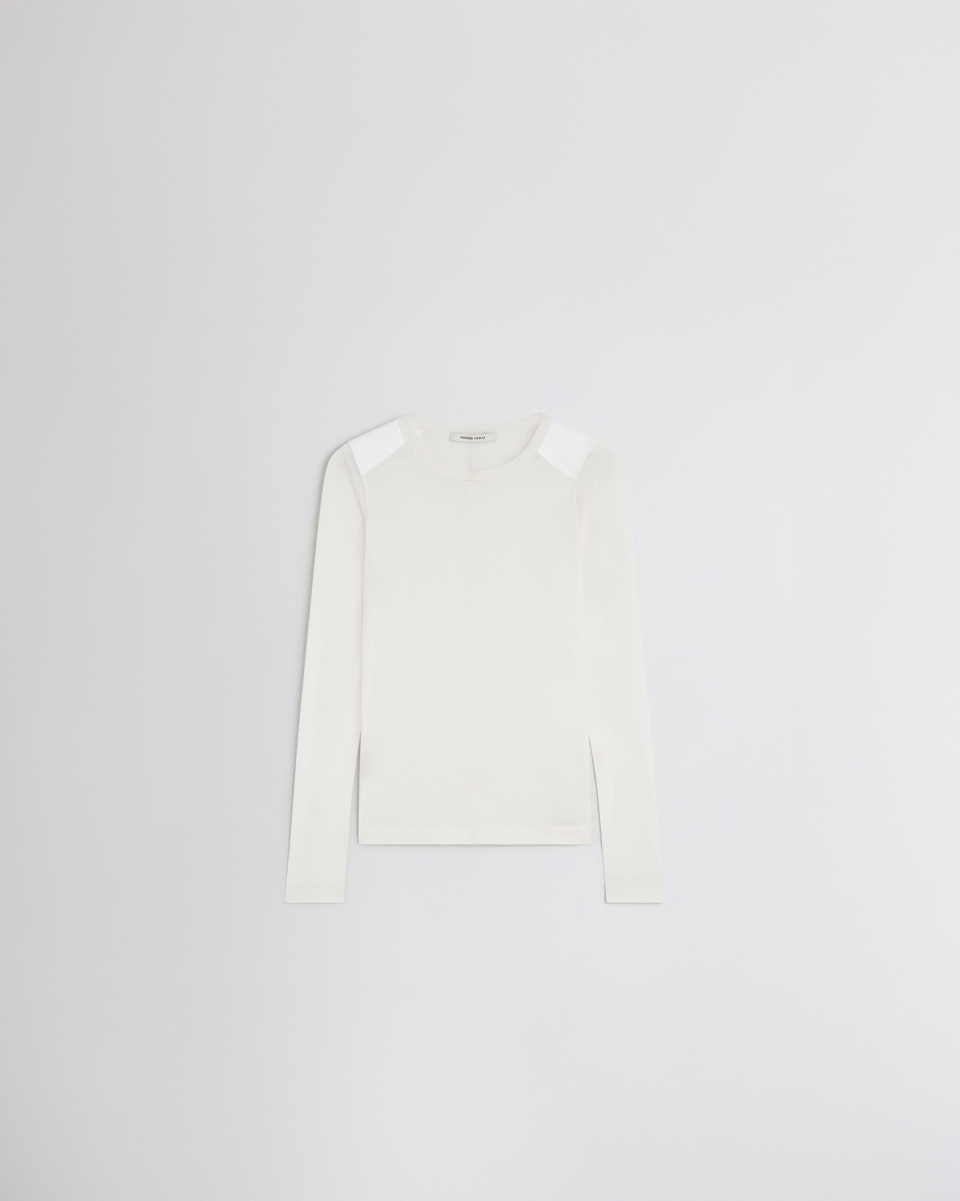 Crewneck tank top in ultra-fine ivory cotton. Semi-sheer, the slub top has seam detailing down the front and back, an opaque ribbed neck, rolled cuffs and hem, and cotton panels on the shoulders and elbows. A versatile layering piece.