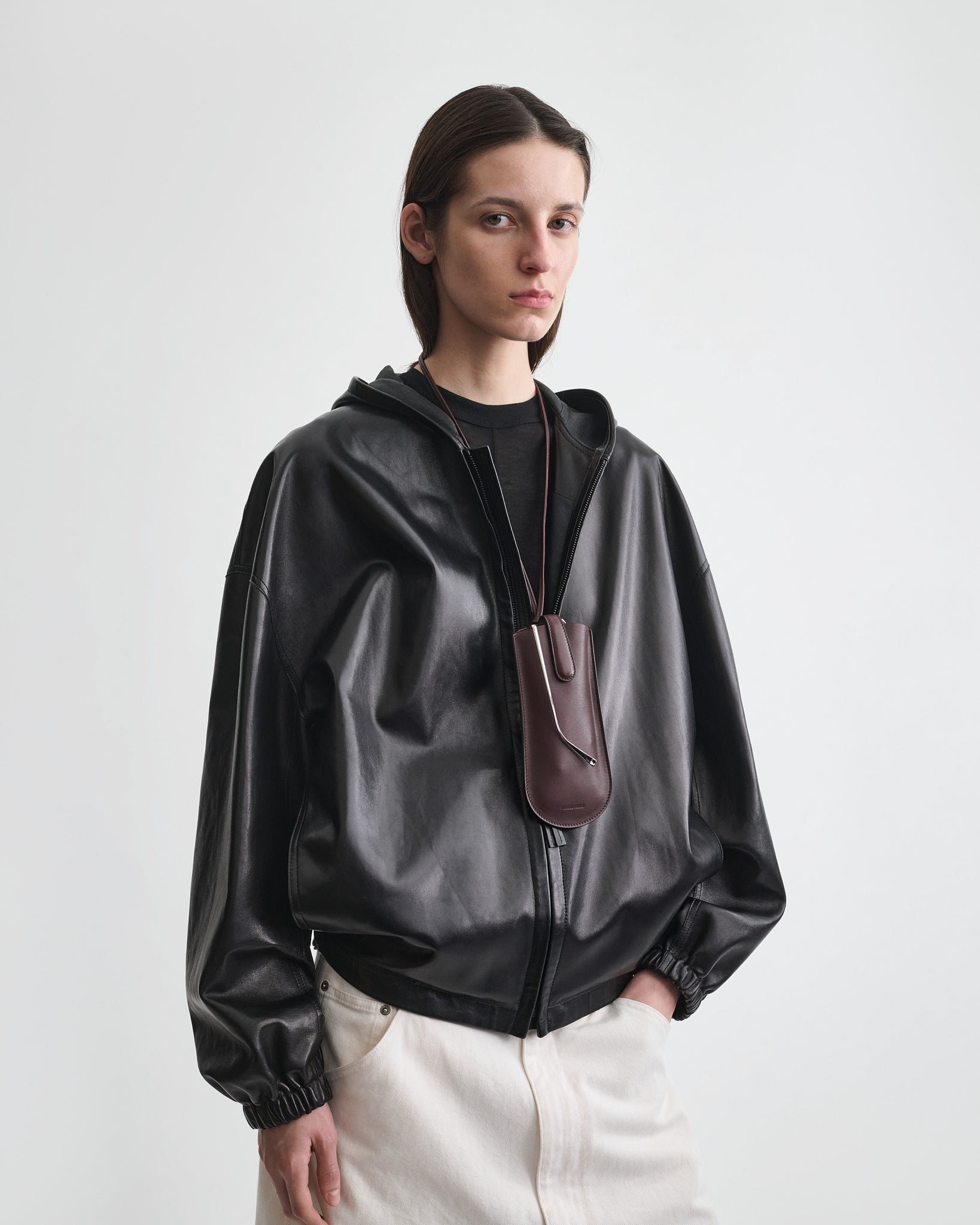 Glasses pouch in oxblood leather. Slim leather strap, magnetic tab fastening and a tonal suede interior.