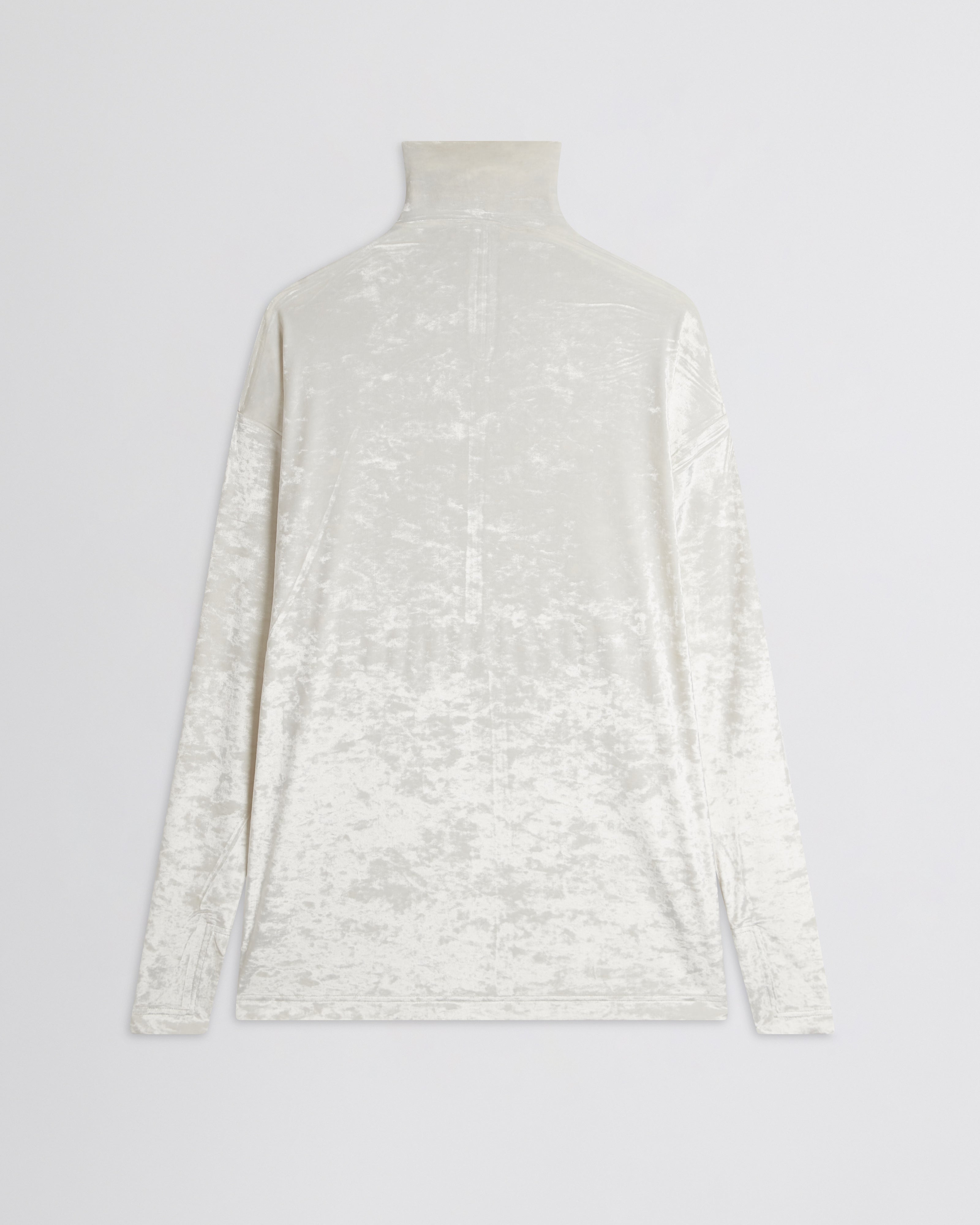 High neck top in white crushed velvet. Fluid and generously cut in the body with sleeves that narrow at the wrist. Zip fastening at the back of the neck.