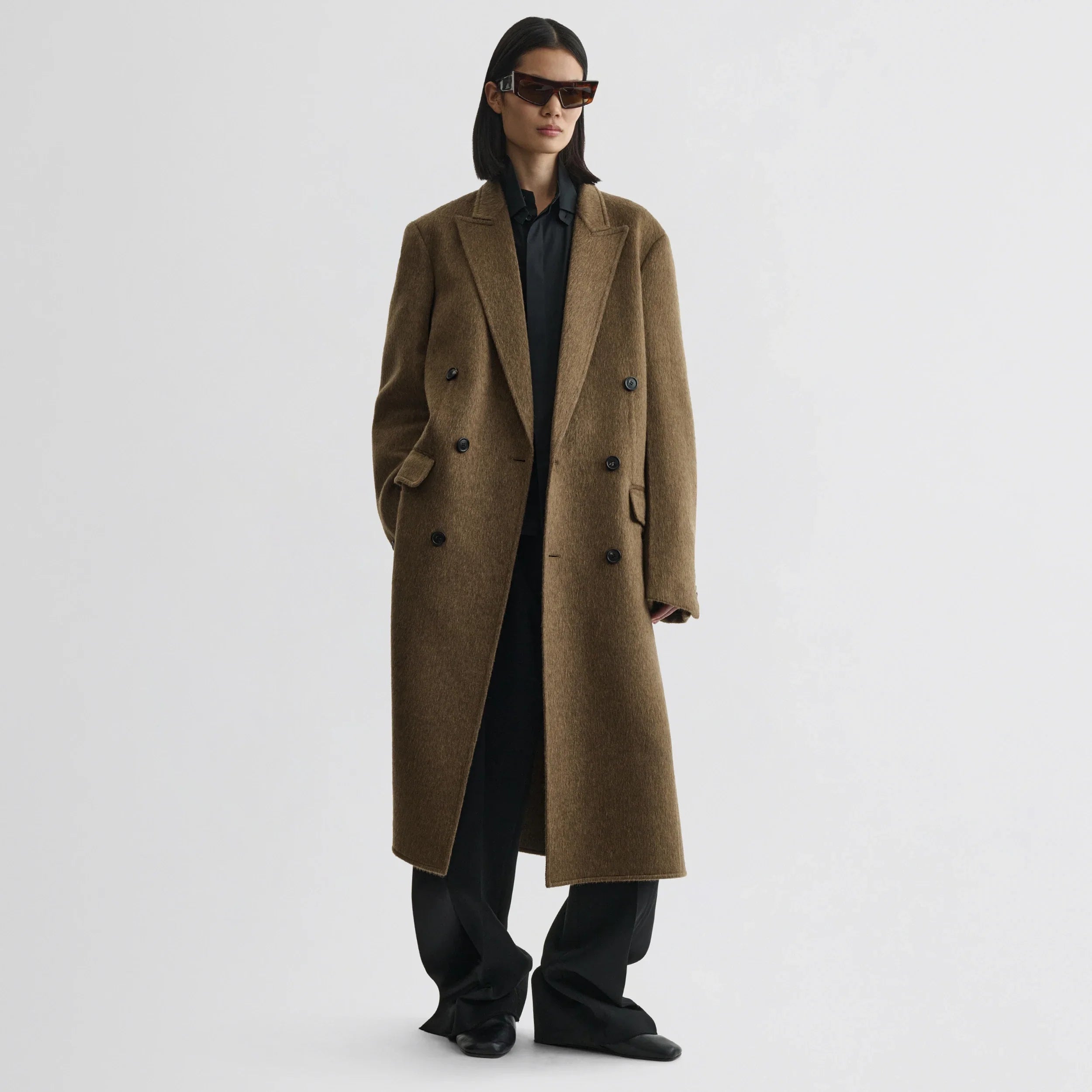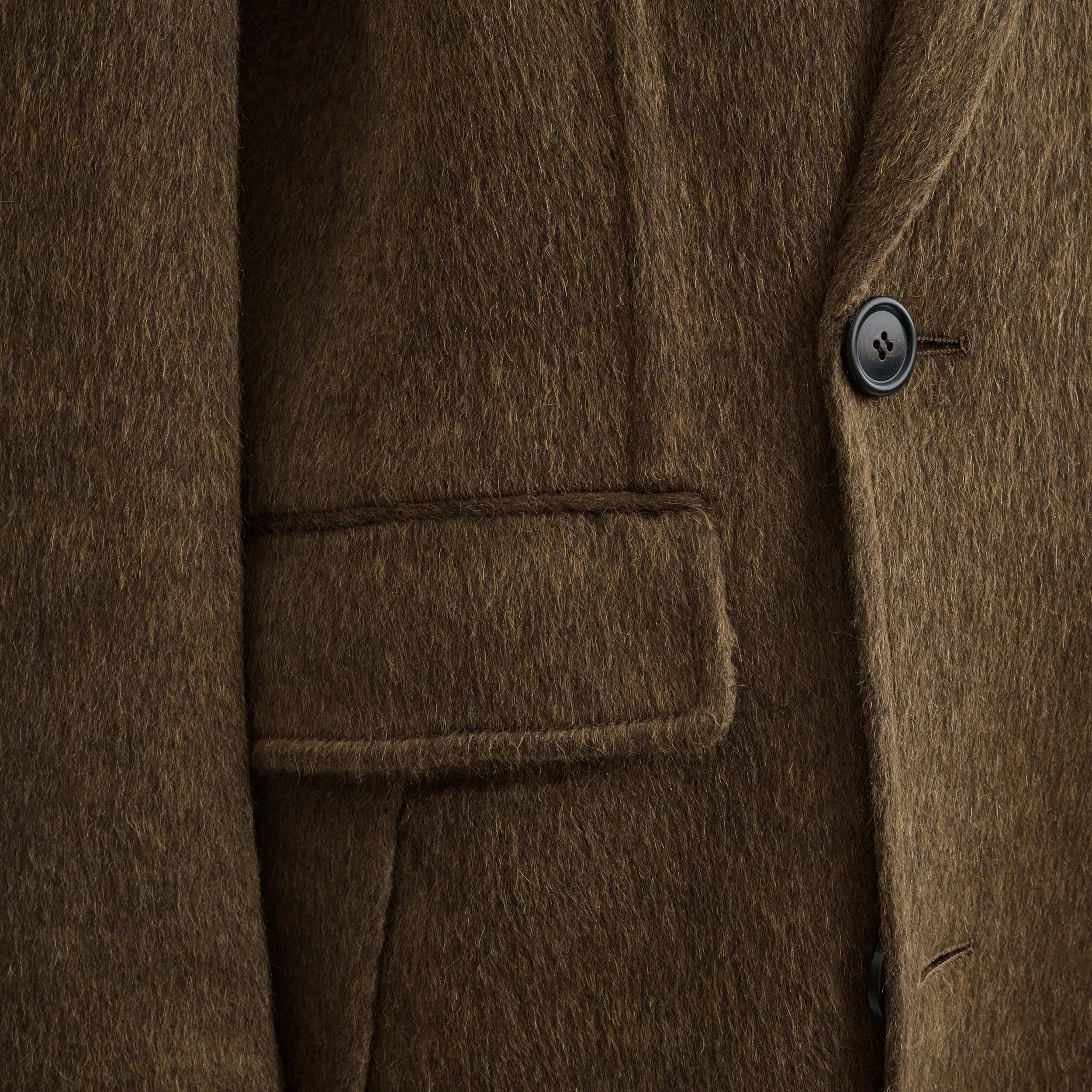 Man’s coat in bronze khaki wool mohair. Double breasted with horn buttons. The coat has inverted sleeves, a lightly structured shoulder, dropped contour waist and slits towards the front. Partially lined, the double face construction ensures the coat is both warm and lightweight. The brushed fabric has a slight sheen.