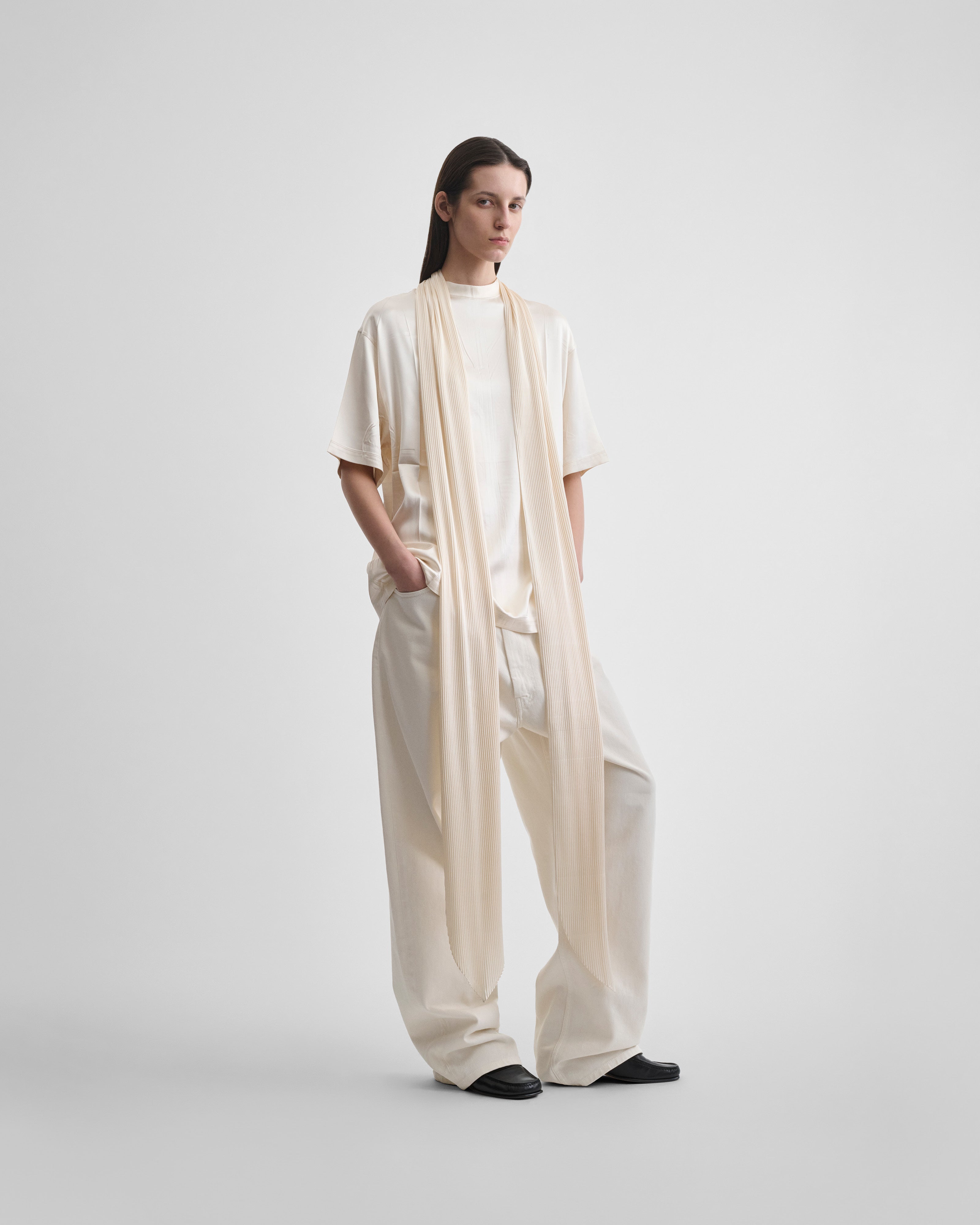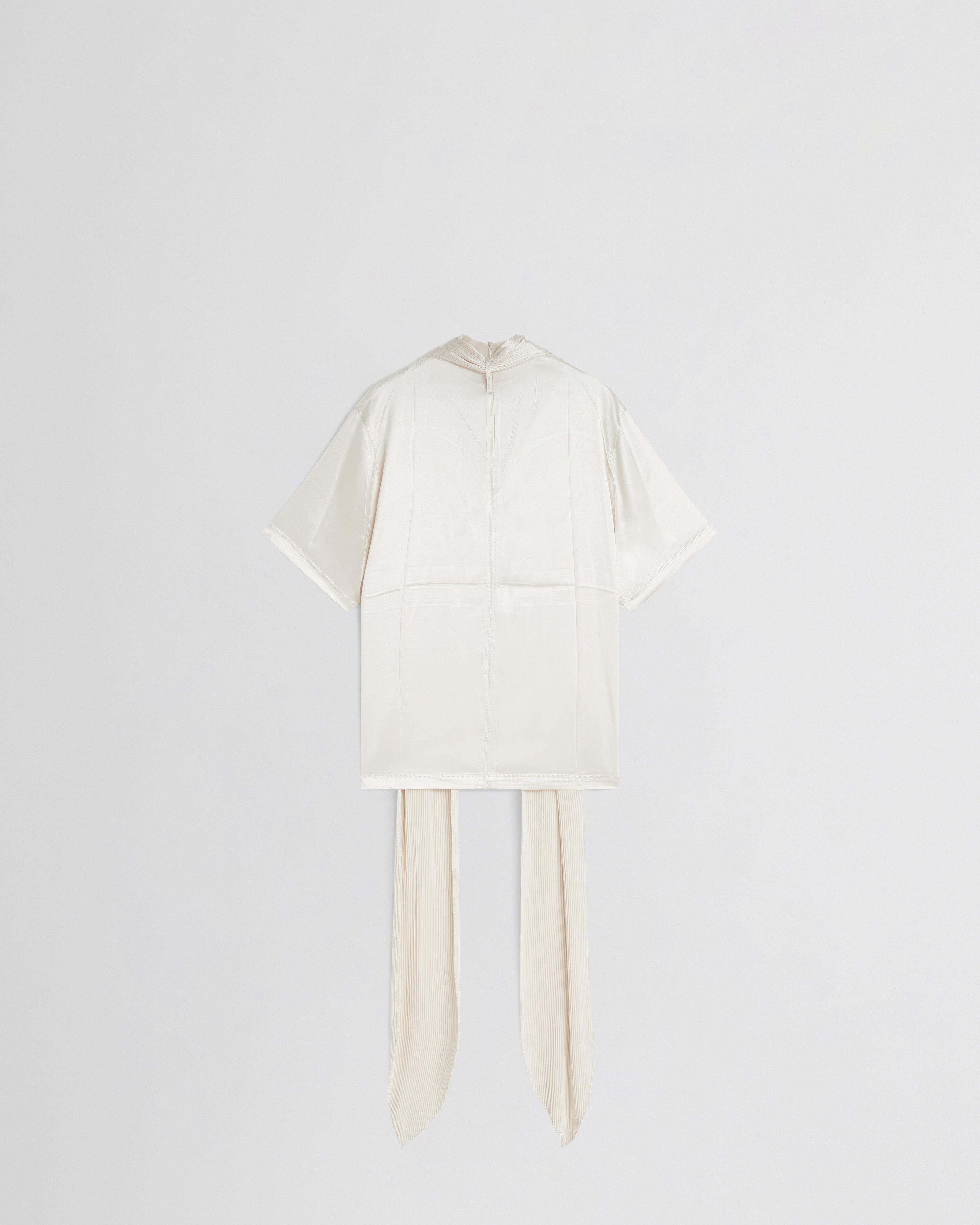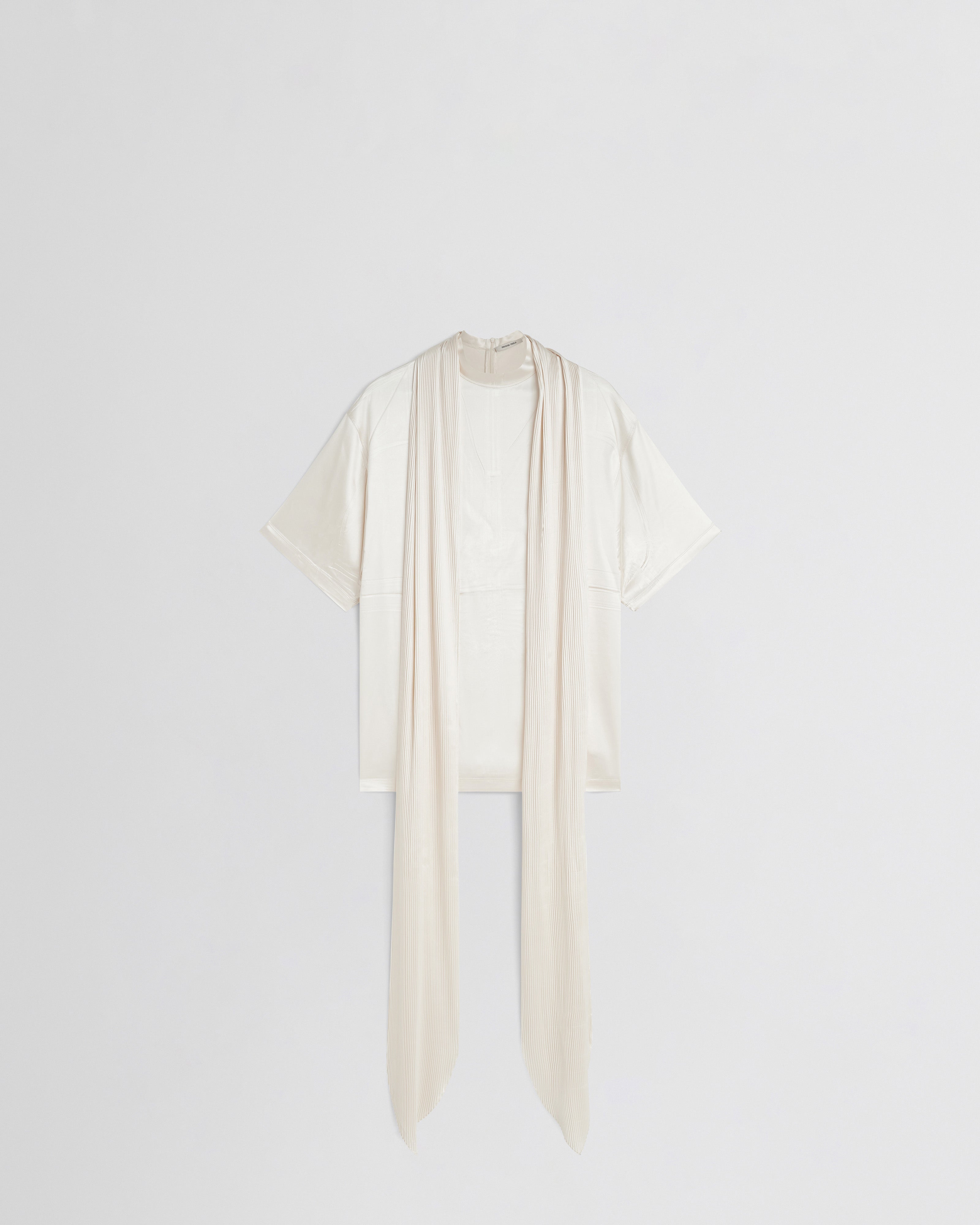 Detachable scarf T-shirt in cream stretch silk satin. A loop at the centre back holds the pleated scarf in place. Generous cut, hard pressed, the fabric has a light sheen and soft hand.